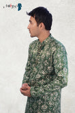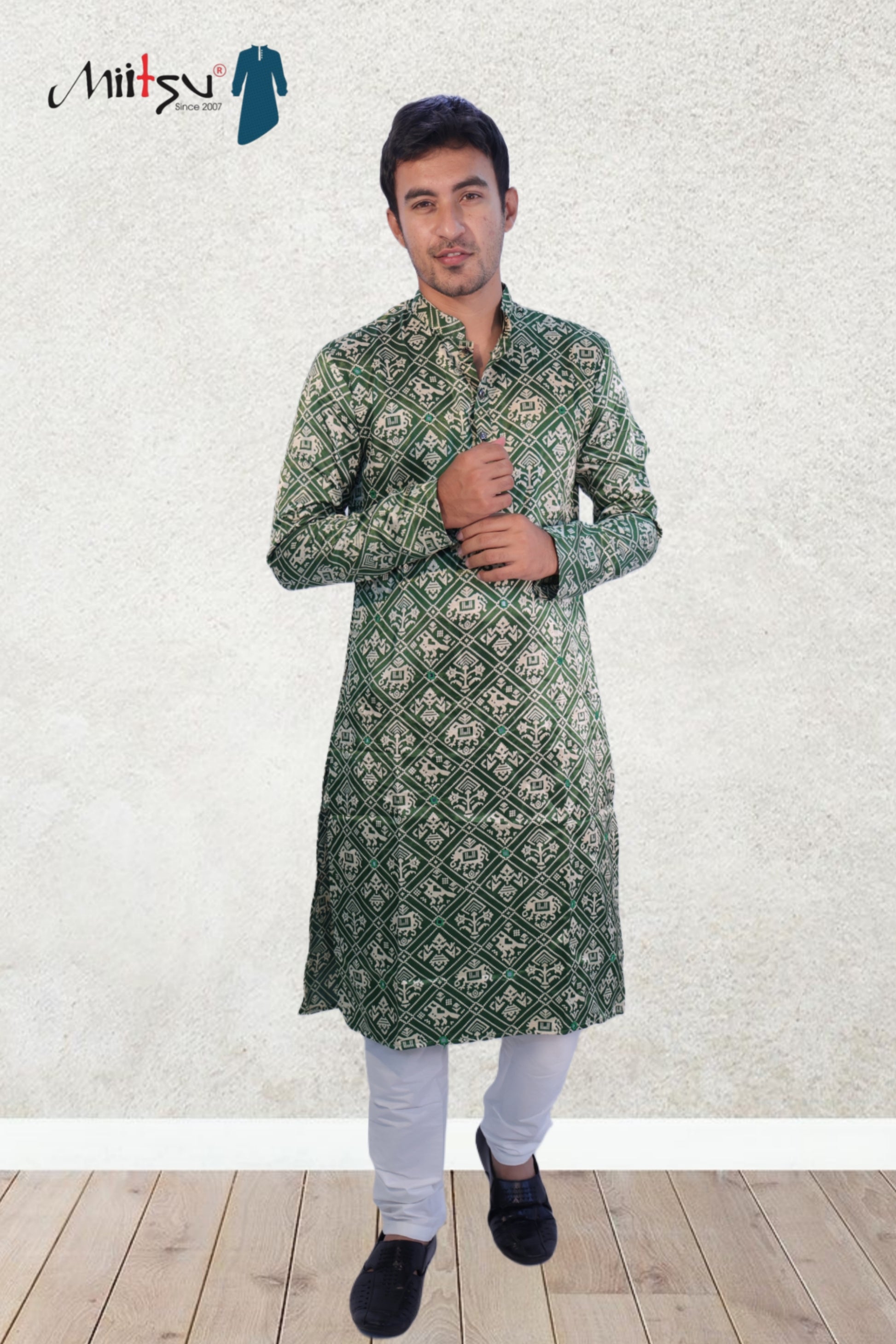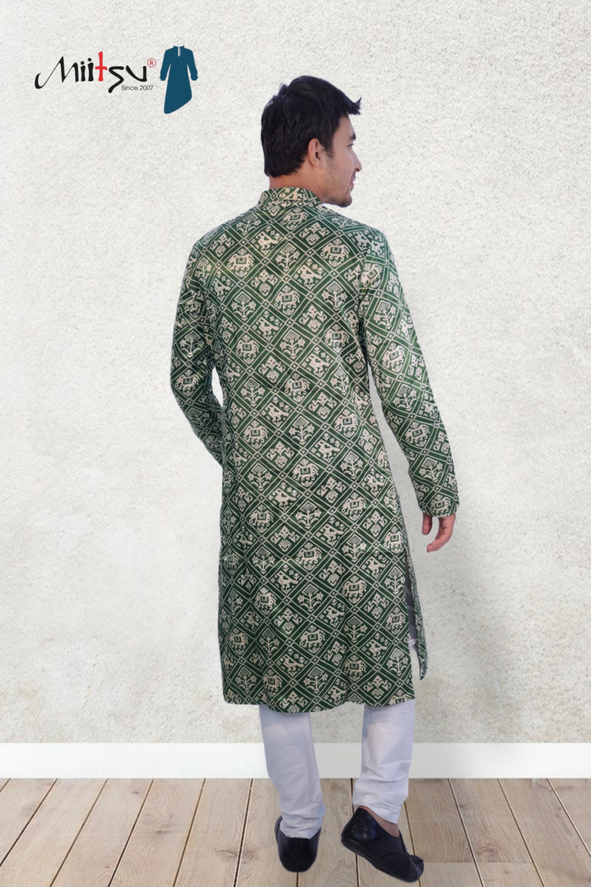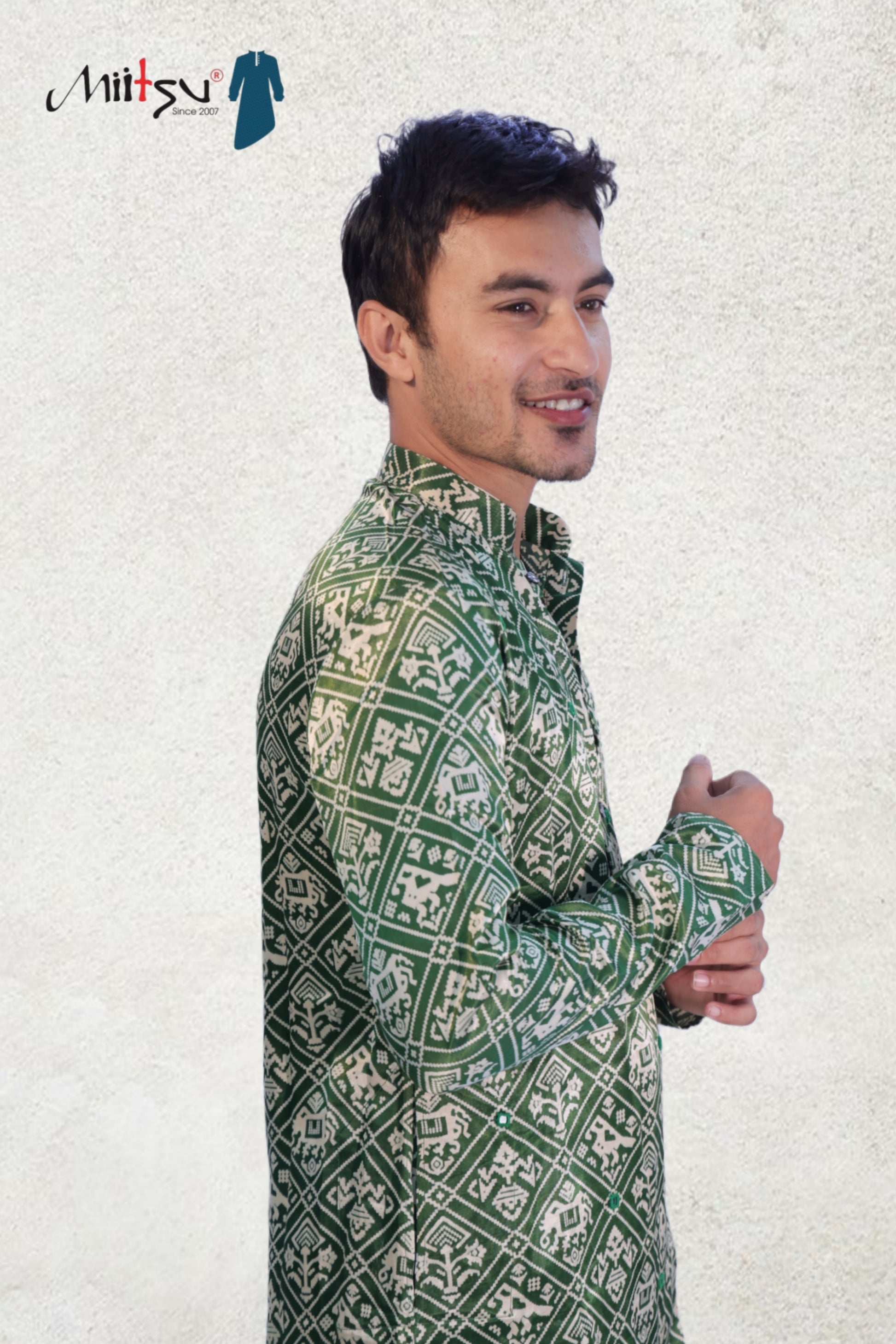 into timeless tradition with a modern twist in our Emerald Heritage Men's Printed Kurta, part of the exclusive Ethnic Elegance Collection. Crafted with intricate precision, this full-sleeve kurta features a captivating green and white geometric and tribal-inspired print that reflects rich cultural heritage.