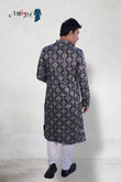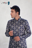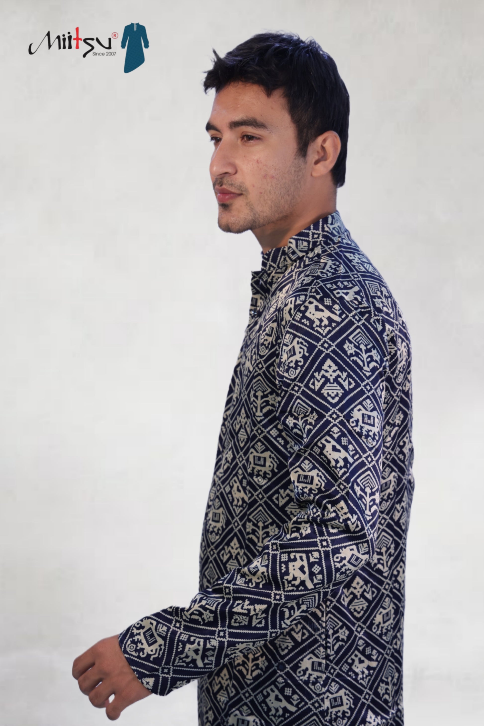 Step into regal sophistication with this navy royal printed kurta, a perfect blend of traditional artistry and modern flair. The kurta features an elegant ivory geometric and floral motif pattern across a rich navy base, giving it a bold yet graceful look.