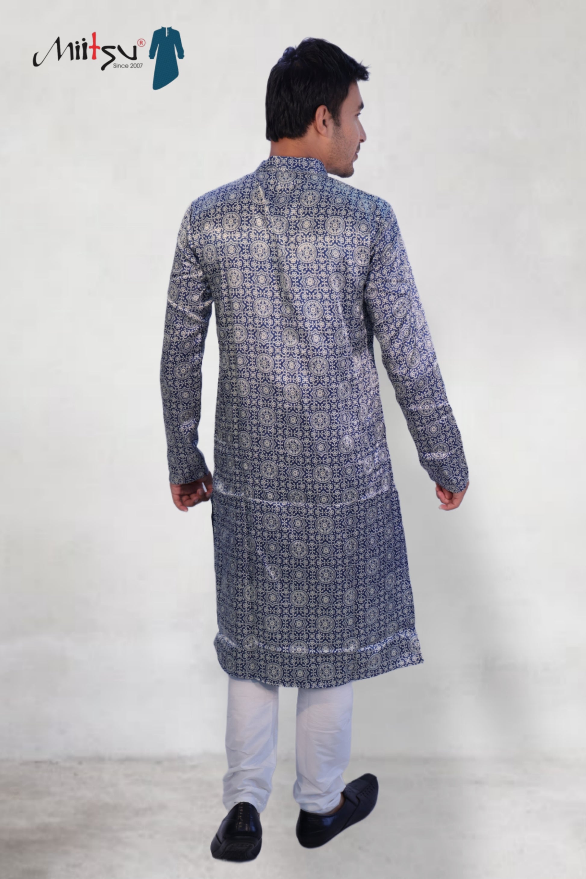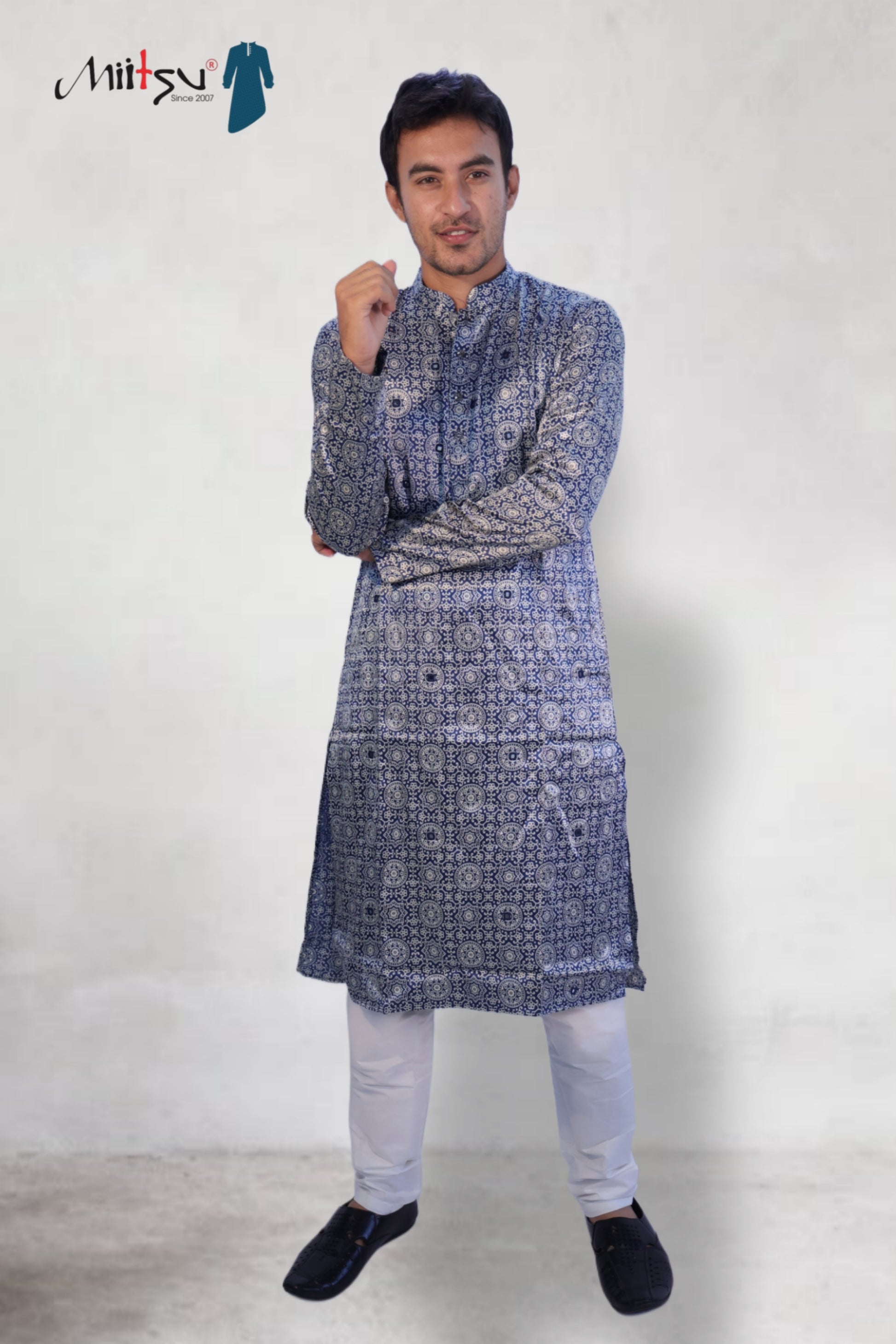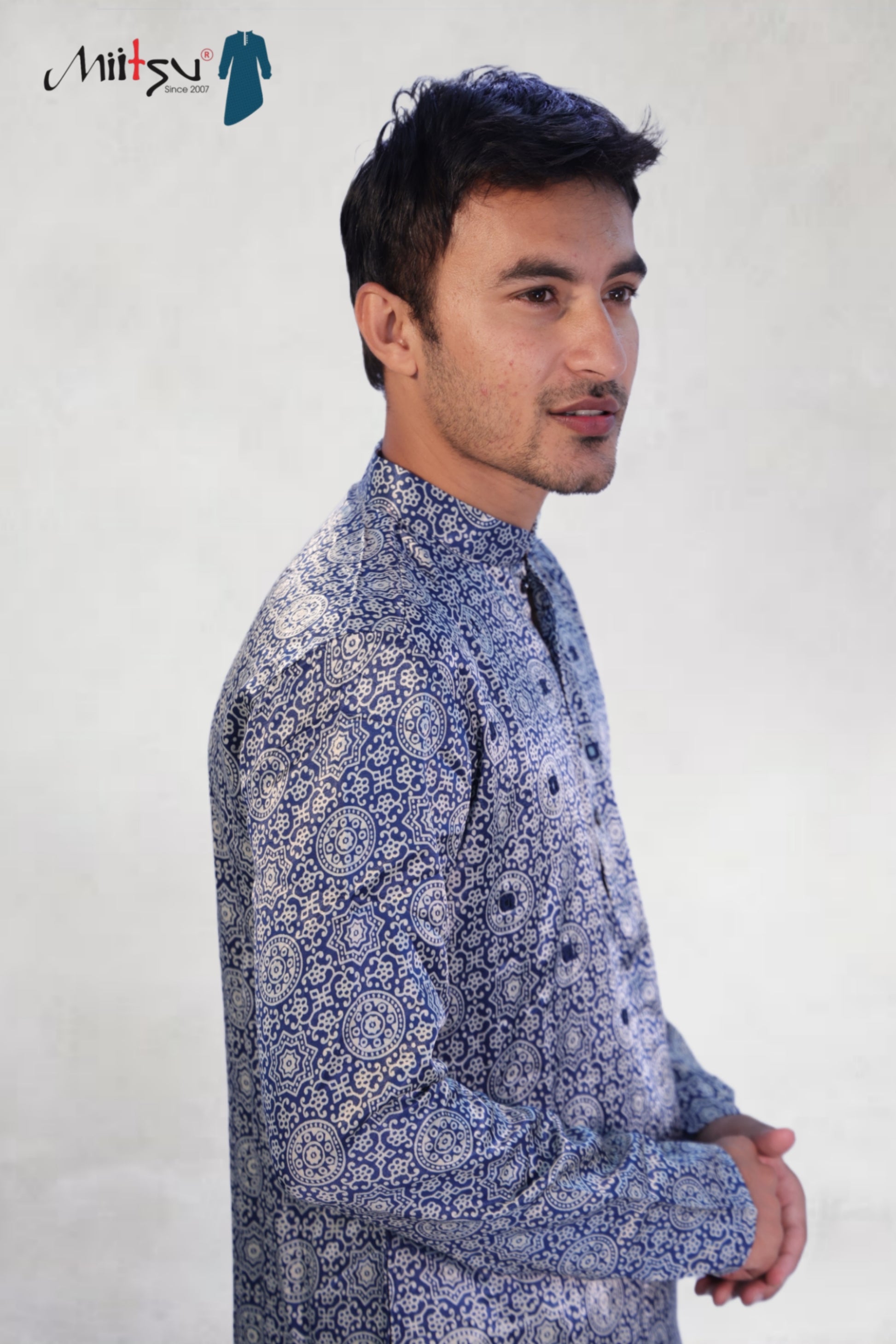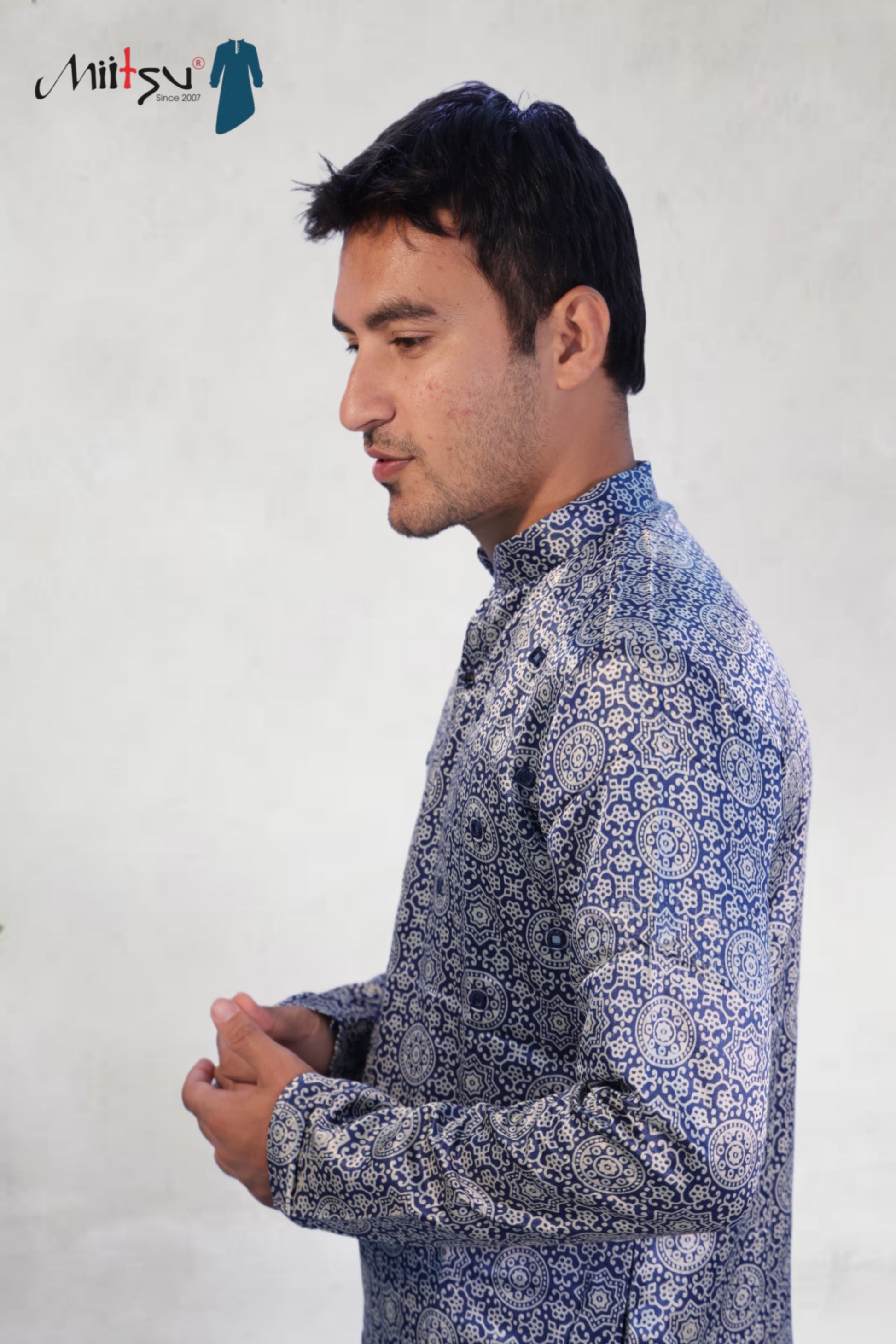 Elevate your ethnic style with this stunning indigo printed kurta that captures a perfect balance of tradition and trend. The intricate geometric-inspired print in deep blue tones gives it a rich, artistic edge — ideal for the modern man who loves classic sophistication with a twist. Crafted from soft, breathable fabric, this kurta ensures all-day comfort while maintaining a premium, structured look. Pair it with white churidar or slim-fit trousers to complete a sharp festive ensemble.
