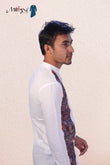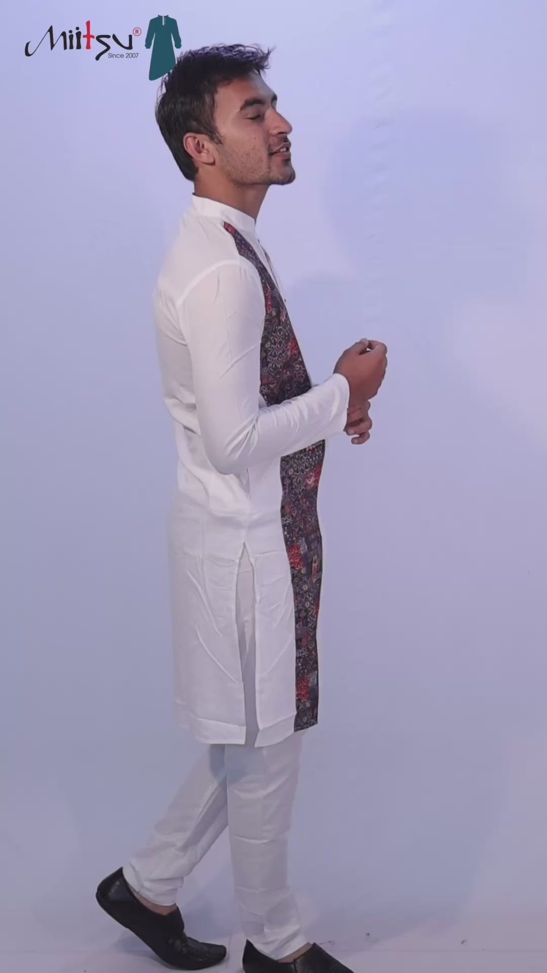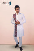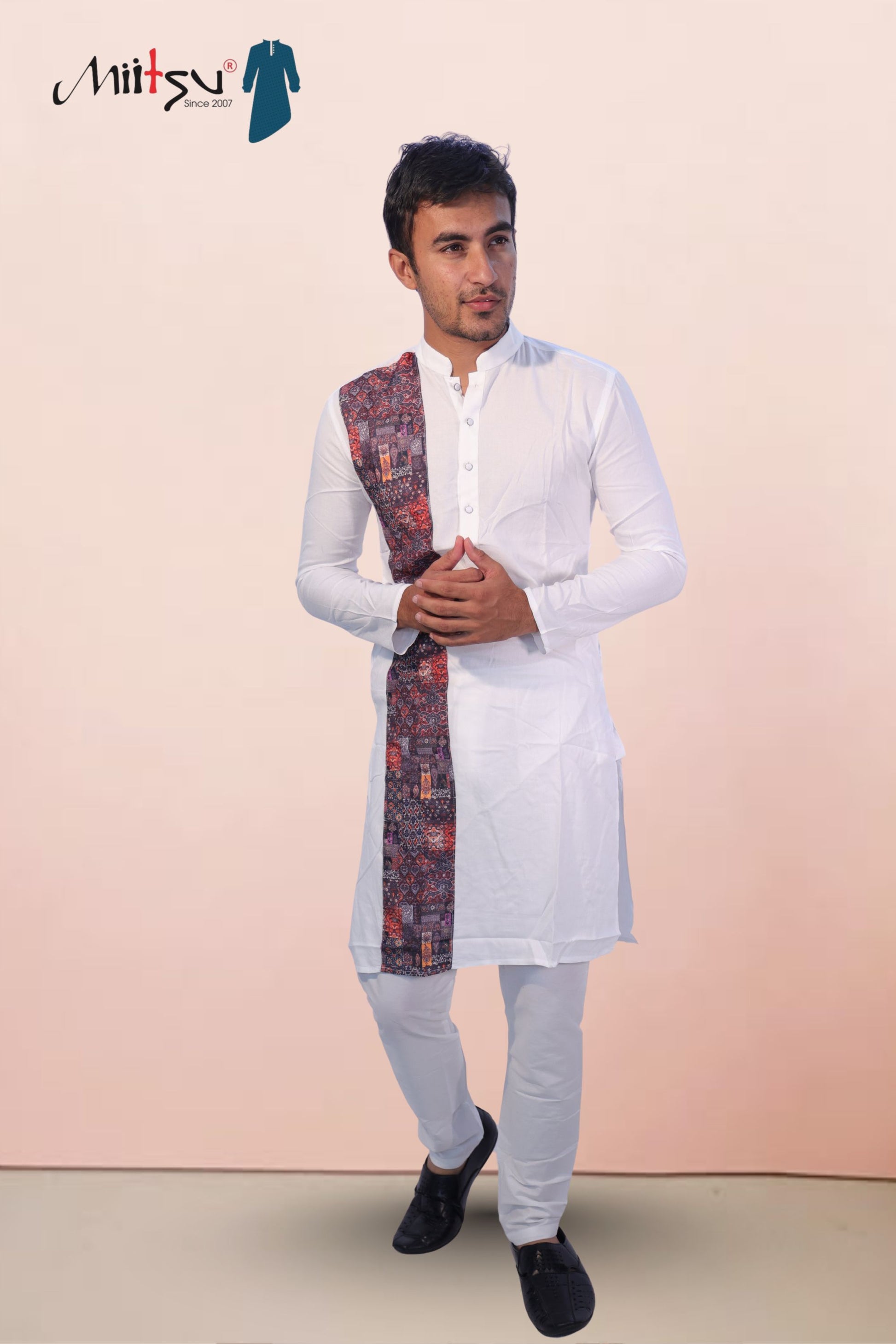 Brighten your wardrobe with the White Mosaic Accent Kurta, a modern classic designed for refined style. The crisp white base creates a clean, sophisticated look, while the striking mosaic-print panel in warm reds and earthy tones adds a unique artistic touch.