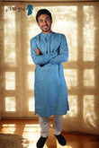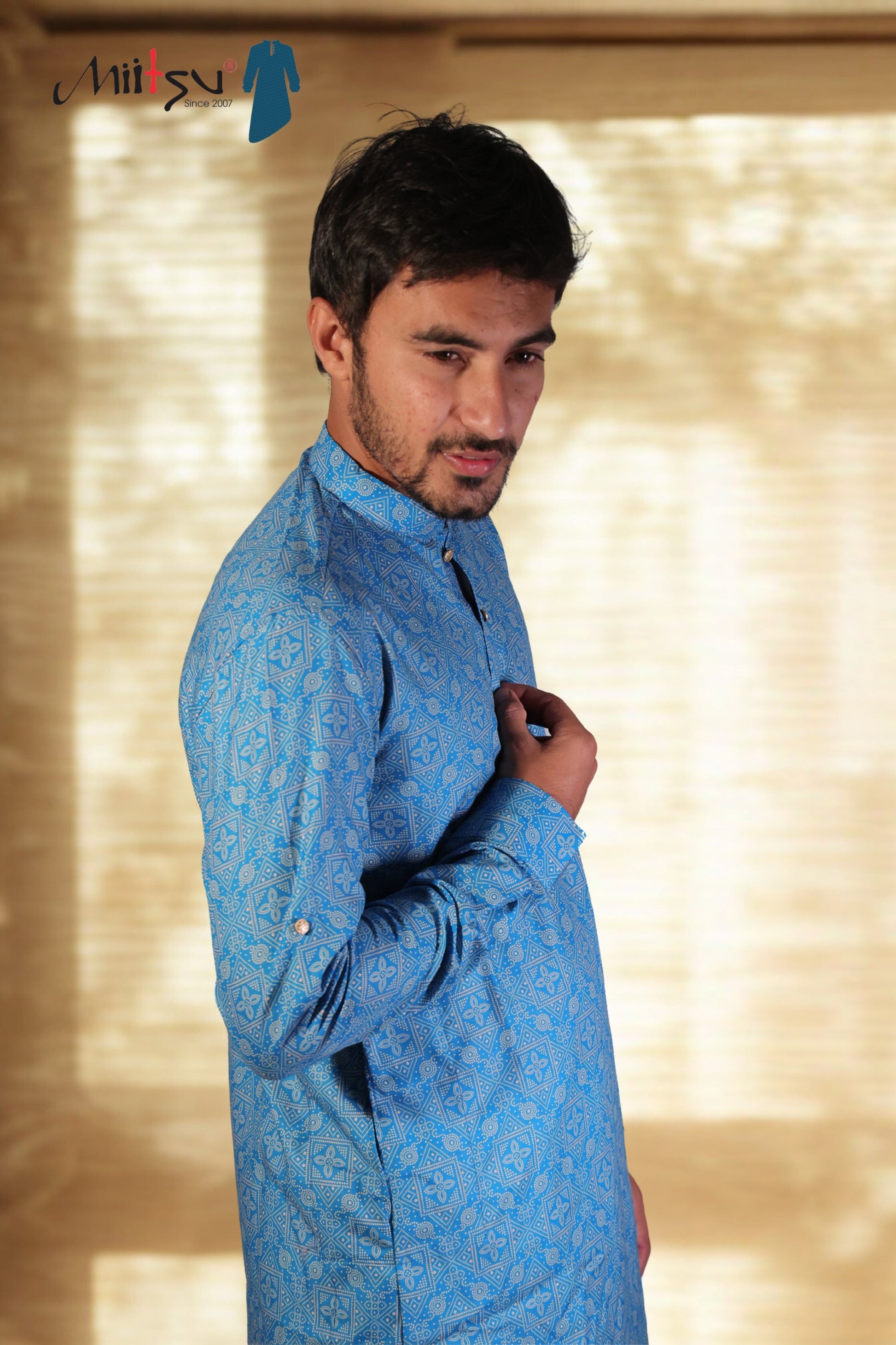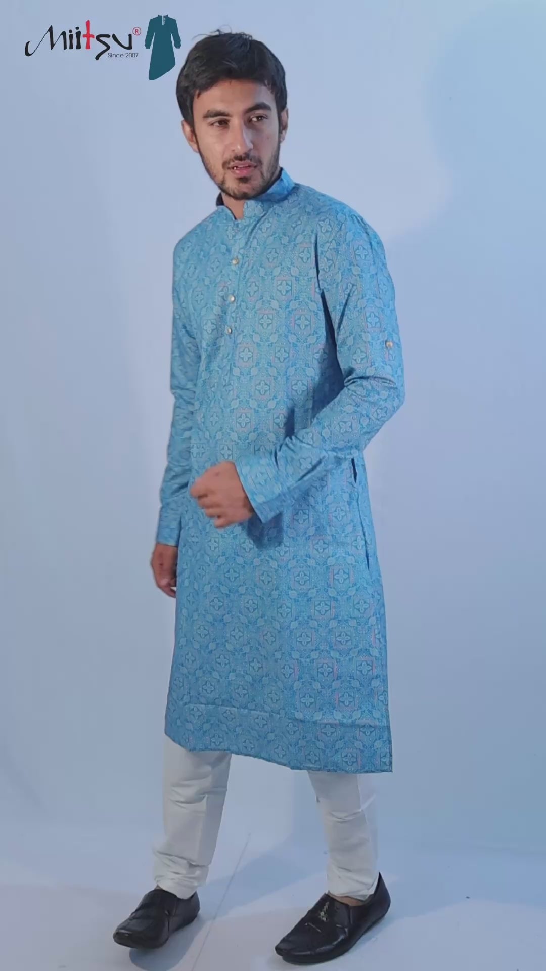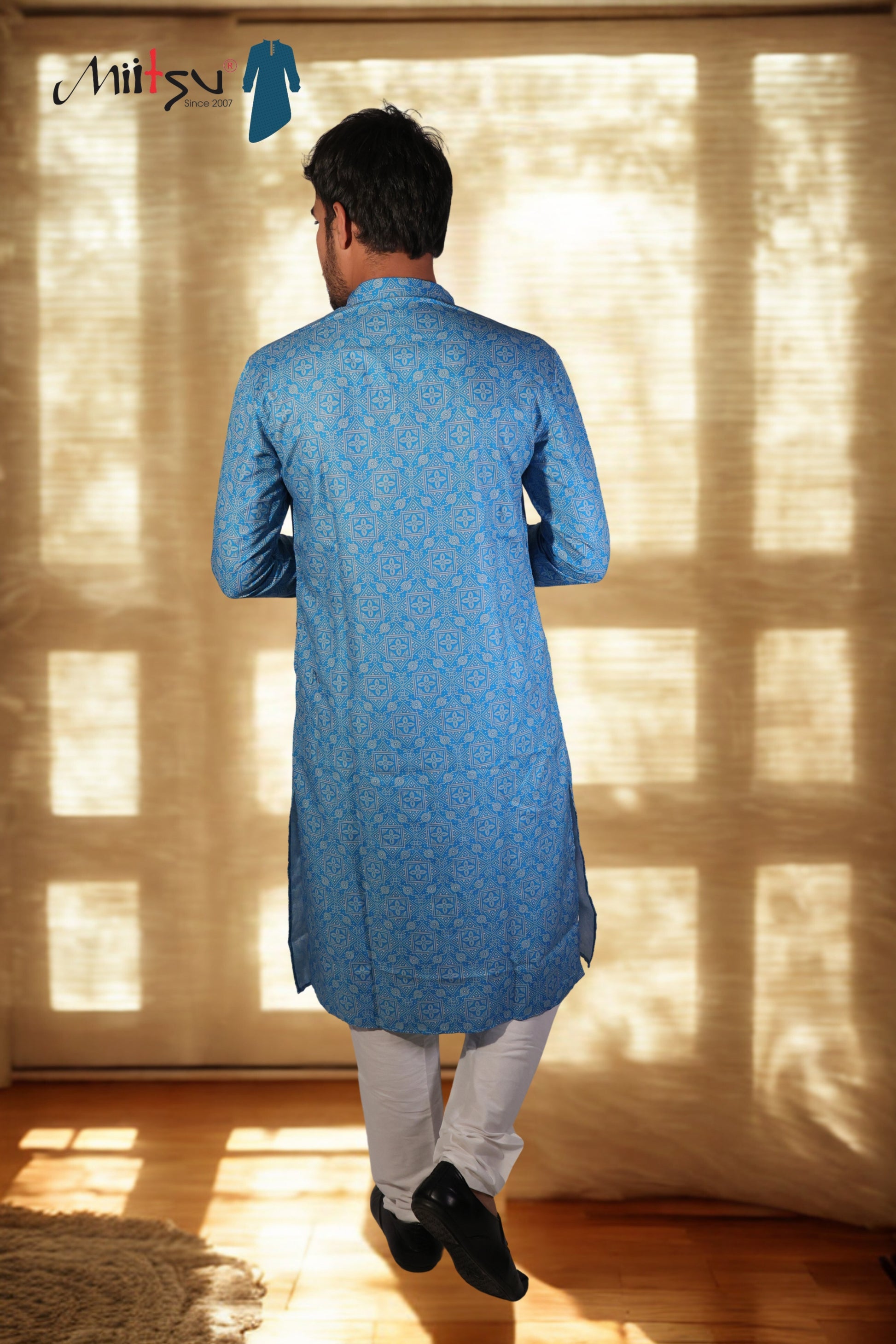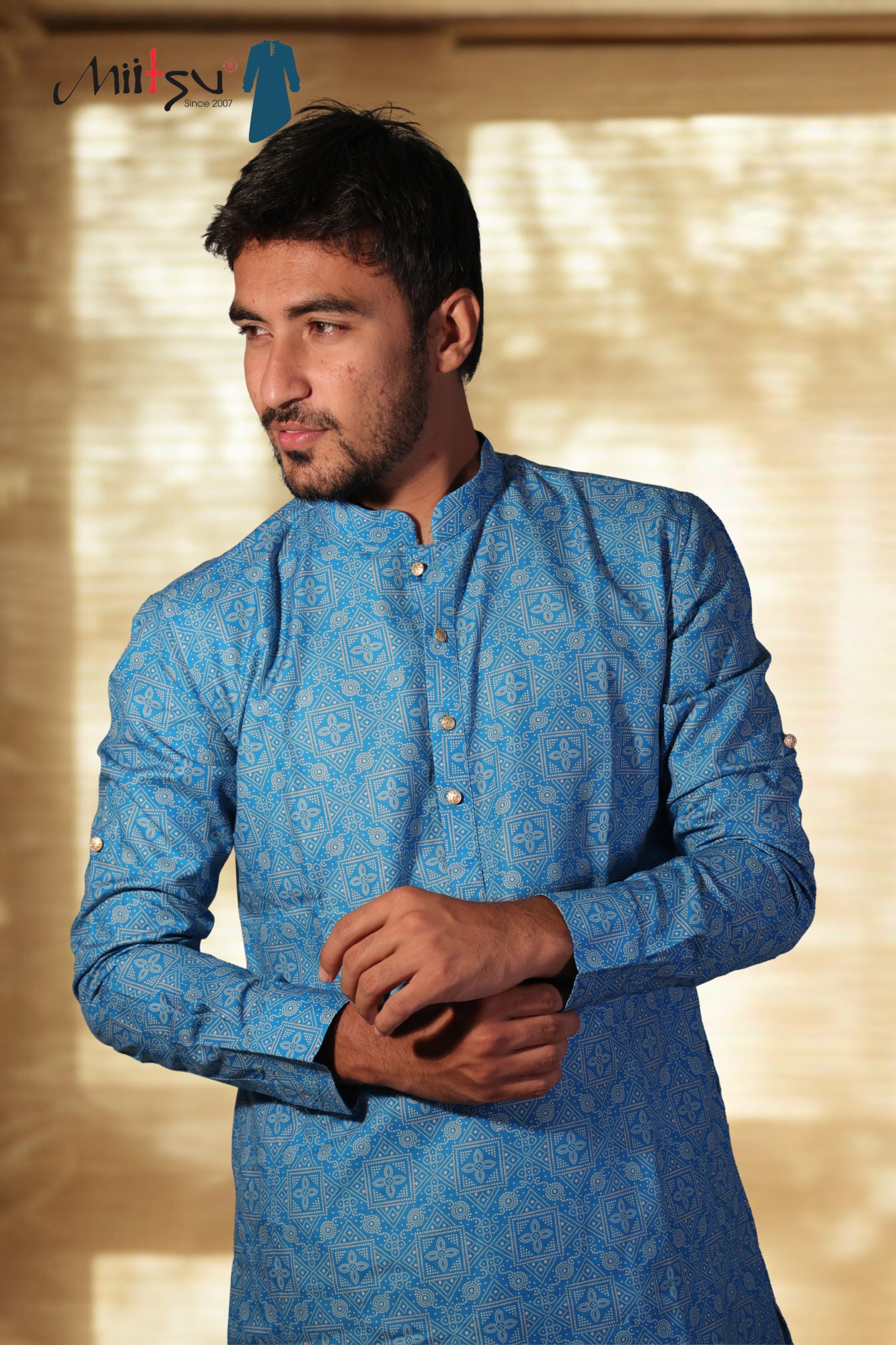 Add a refreshing touch of royalty to your ethnic wardrobe with the Azure Majesty Kurta from Miitsu. Crafted in a striking shade of blue, this kurta is adorned with intricate geometric prints inspired by timeless heritage patterns. The mandarin collar, golden metallic buttons, and tailored fit give it a refined appeal, making it a perfect pick for festive occasions, weddings, or cultural gatherings.