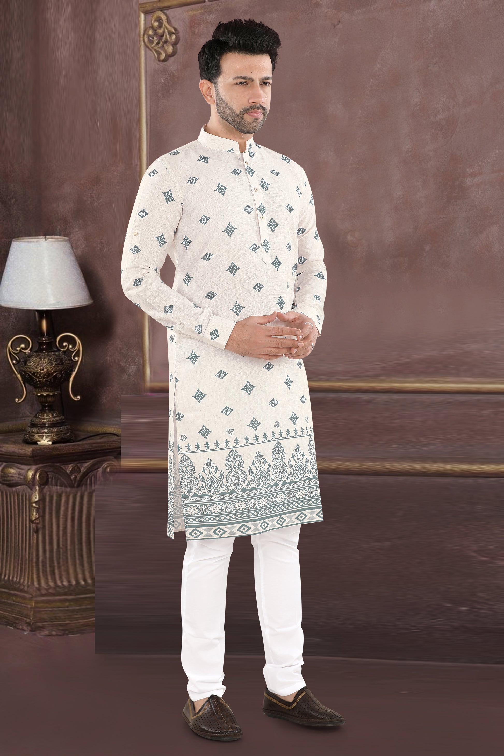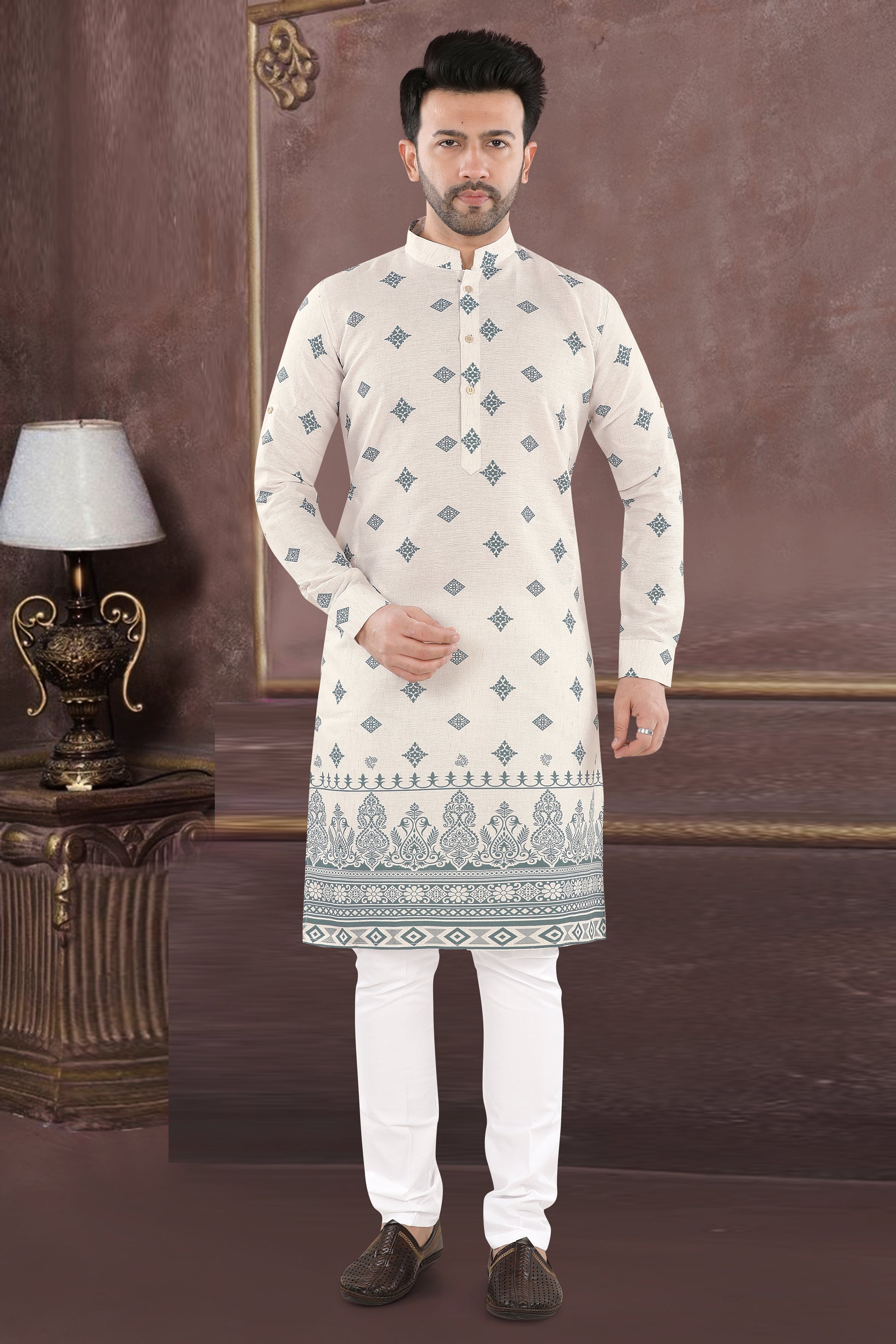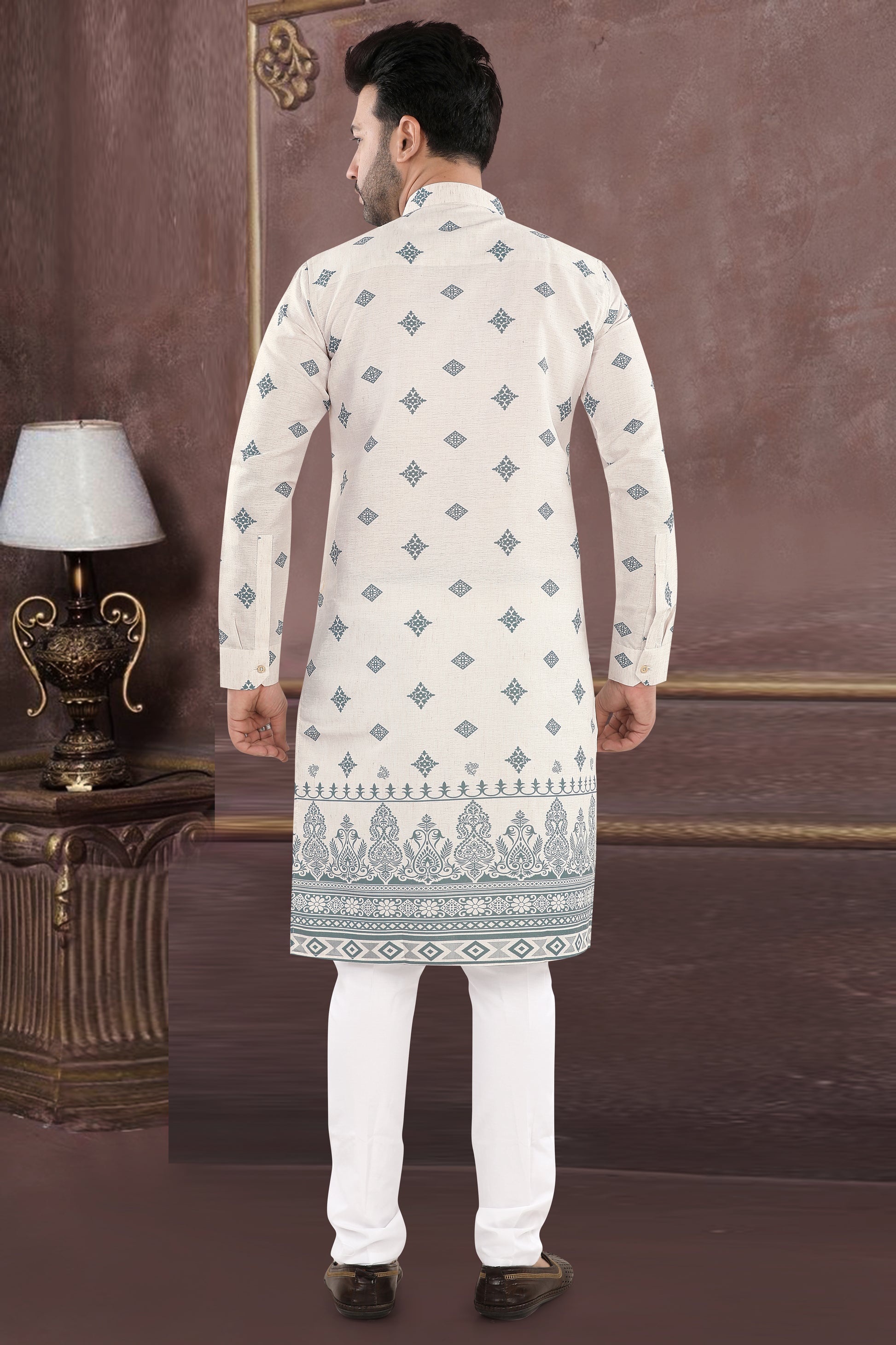 Elevate your traditional style with the Ivory Noor Heritage Kurta, a timeless piece crafted for effortless elegance. Set on a graceful ivory base, this kurta features subtle all-over geometric motifs complemented by a richly detailed heritage-inspired border print at the hem, creating a perfect balance of minimalism and tradition.