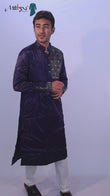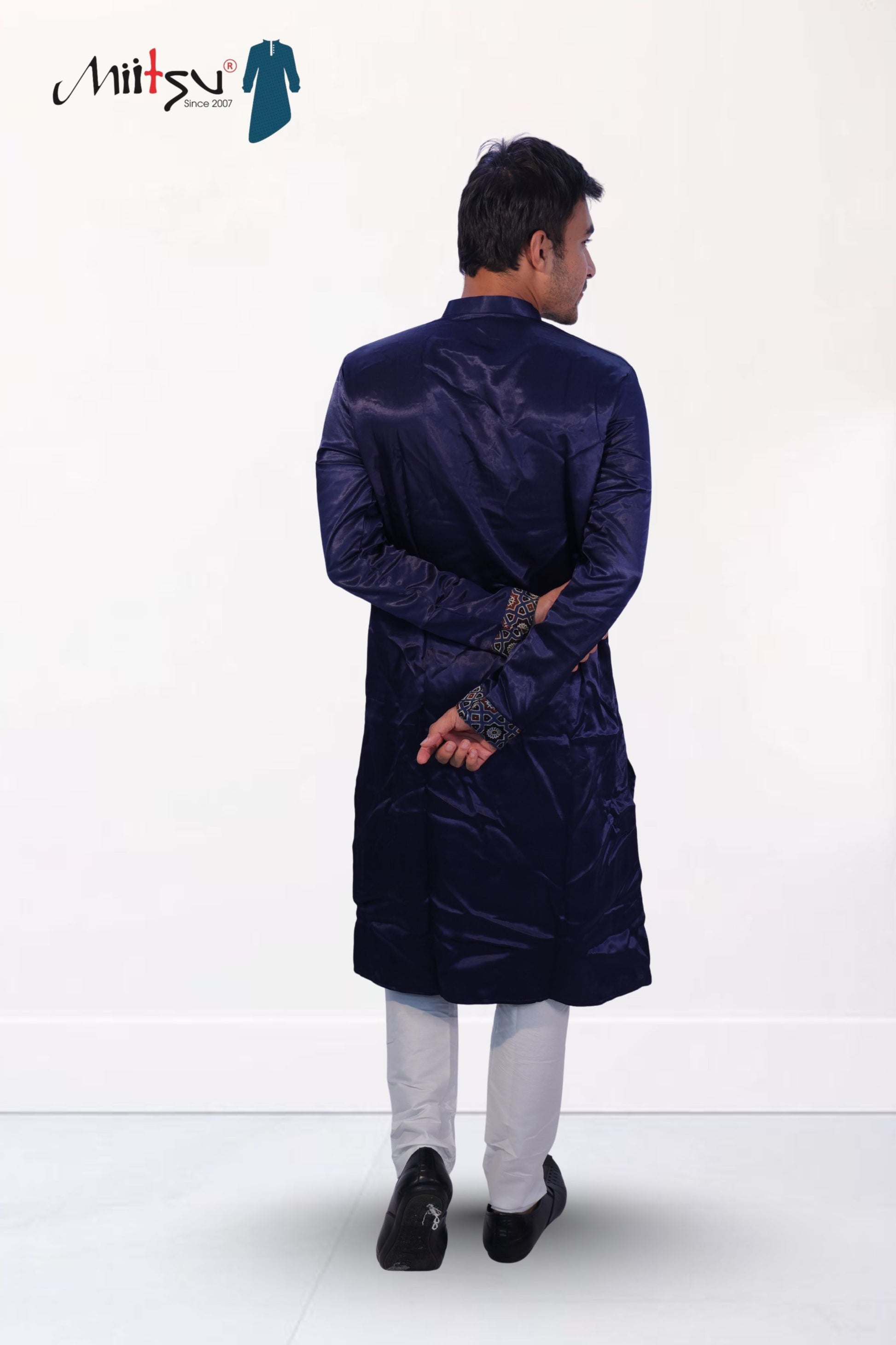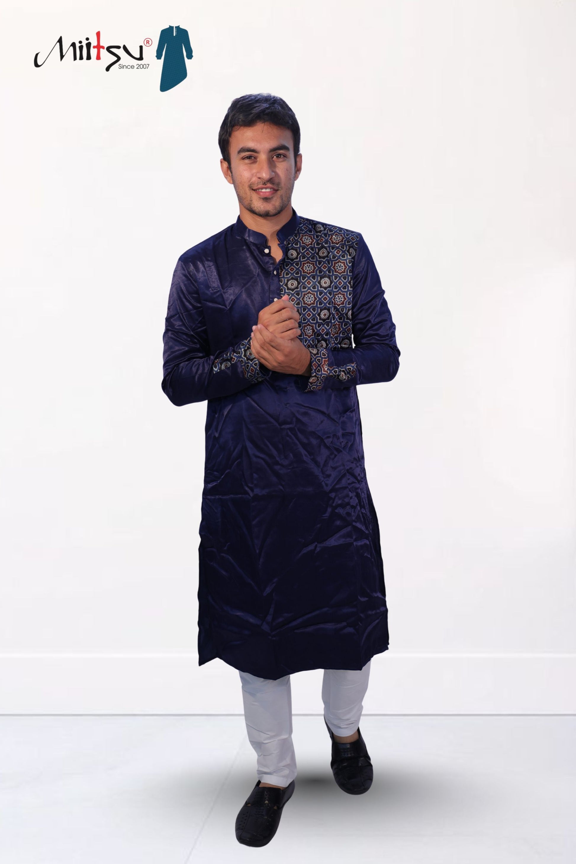 Made from luxurious Mashroo fabric, this kurta carries a natural sheen that elevates its deep navy blue tone. The highlight lies in its ornate geometric embroidered panel along the chest and cuffs — inspired by traditional artistry yet designed with a contemporary edge.