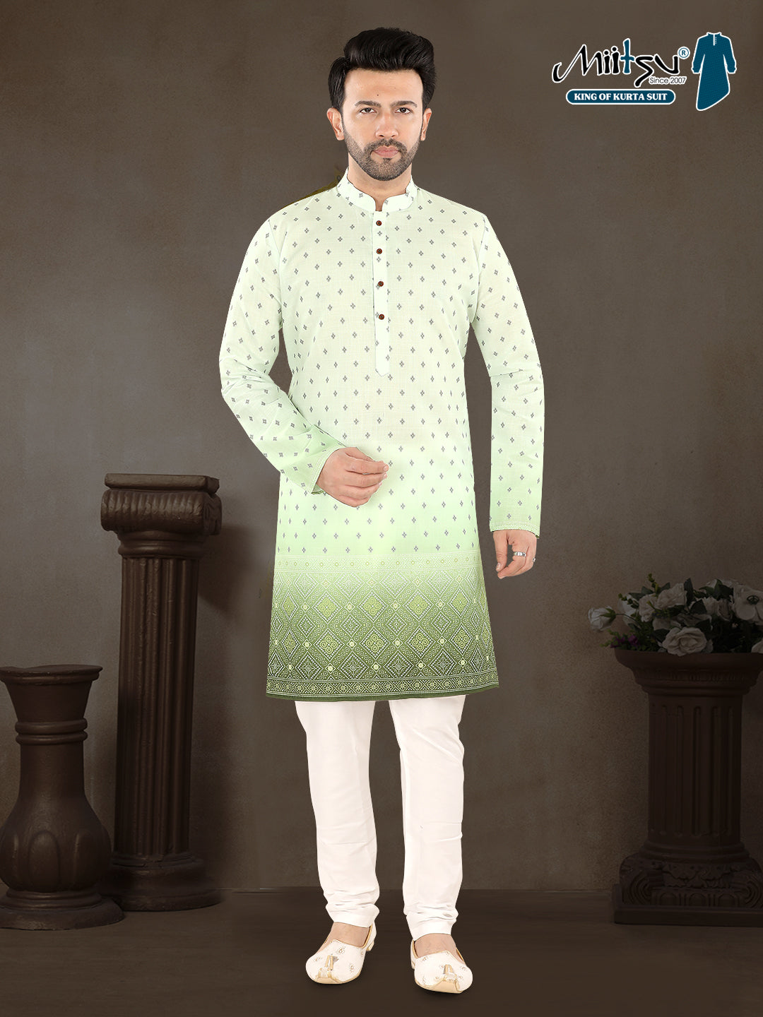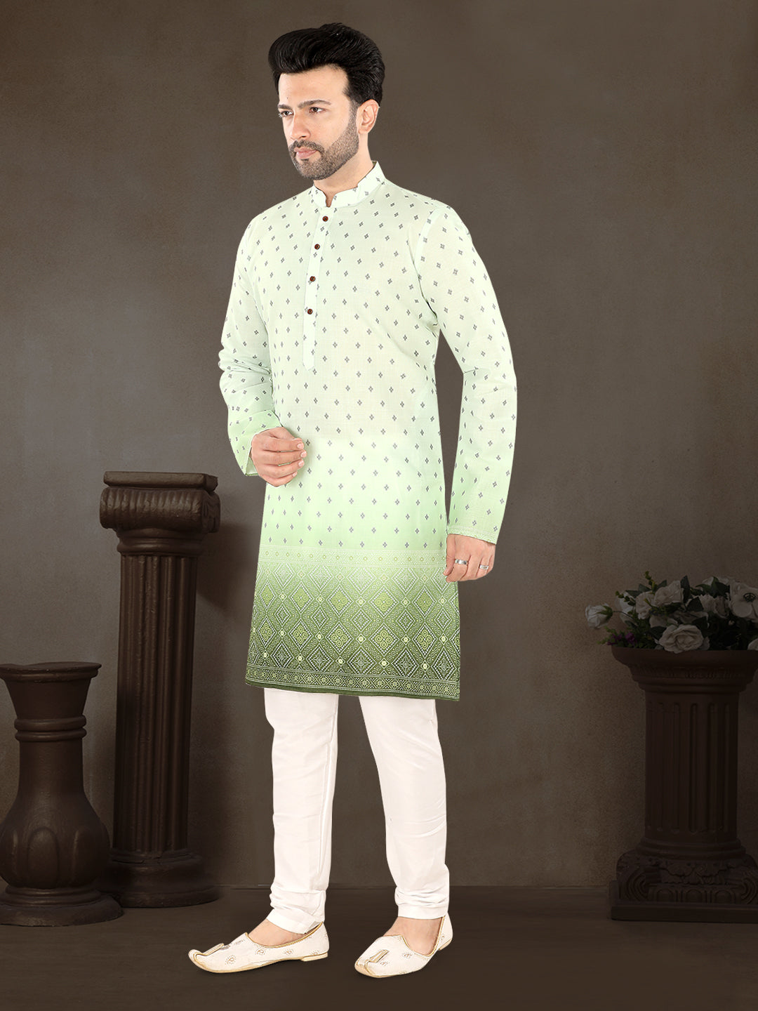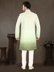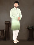 This pista green kurta set is all about freshness, class, and effortless ethnic style. The soothing pastel green base is highlighted with subtle all-over traditional motifs, keeping the look light yet festive.