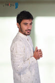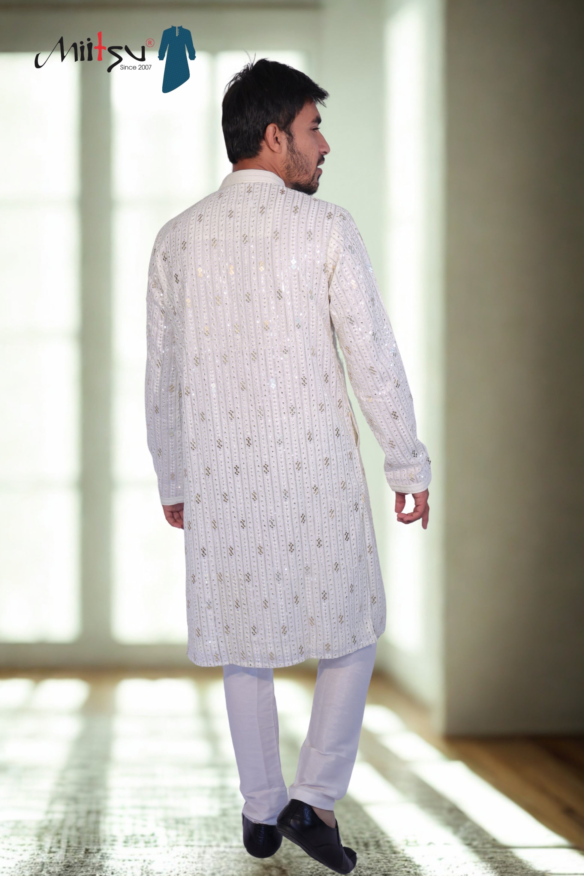 Step into timeless tradition with this exquisite white kurta pajama set from Miitsu. Crafted from premium fabric, the kurta features intricate thread embroidery and subtle sequin work, giving it a refined yet festive charm. Designed with a mandarin collar and full sleeves, it offers both comfort and elegance.